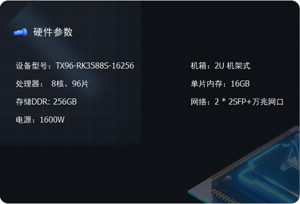 ? ? ? ? ? ?標準2U機架列陣服務器,最高可配置96片高性能模塊,極致算力,抽屜式插拔設計,支持安卓android、unbuntu、centos等多種操作系統。